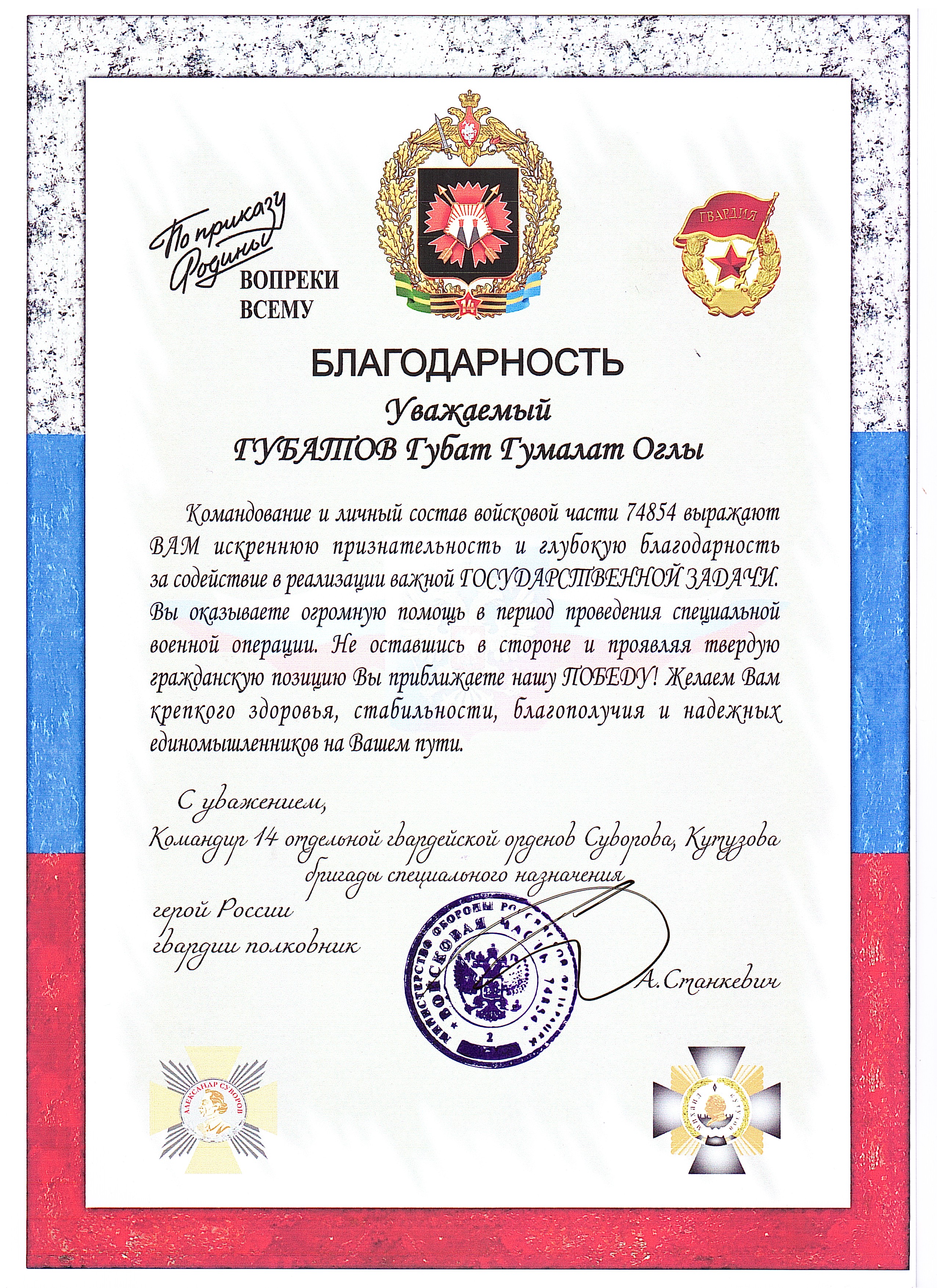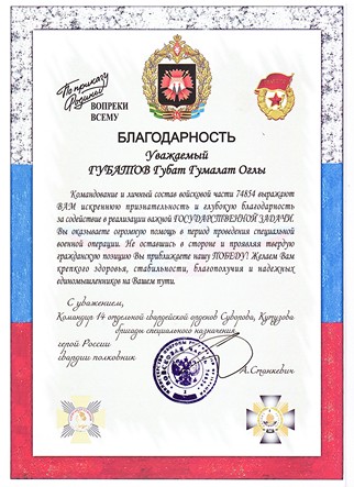 4 февраля 2026 года, в зоне проведения СВО, Президенту, Председателю правления Группы Компаний Безопасности «ГАРАНТ» была вручена медаль "ЗА ПОМОЩЬ ФРОНТУ" и Благодарственное письмо. Надёжность, знания, отвага!